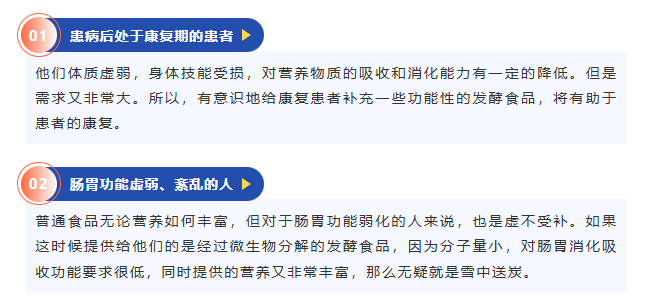 其一,原來食品中的一些營養物質,分子量會變小,更加利于身體吸收利用。?其二,微生物發酵過程還會產生很多新的代謝產物,這些是原來用于發酵的食品原料中所不含有的營養成分。這些微生物代謝產物,會成為特異性營養因子。例如提供小腸粘膜能源的谷氨酰胺、供結腸粘膜能源物質的短鏈脂肪酸,以及亞油酸、精氨酸等等。