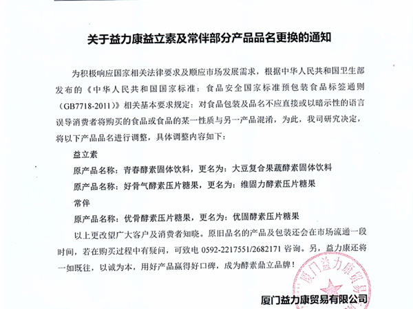 關于益力康益立素及常伴部分產品品名更換的通知 為積極響應國家相關法律要求及順應市場發展需求,根據中華人民共和國…